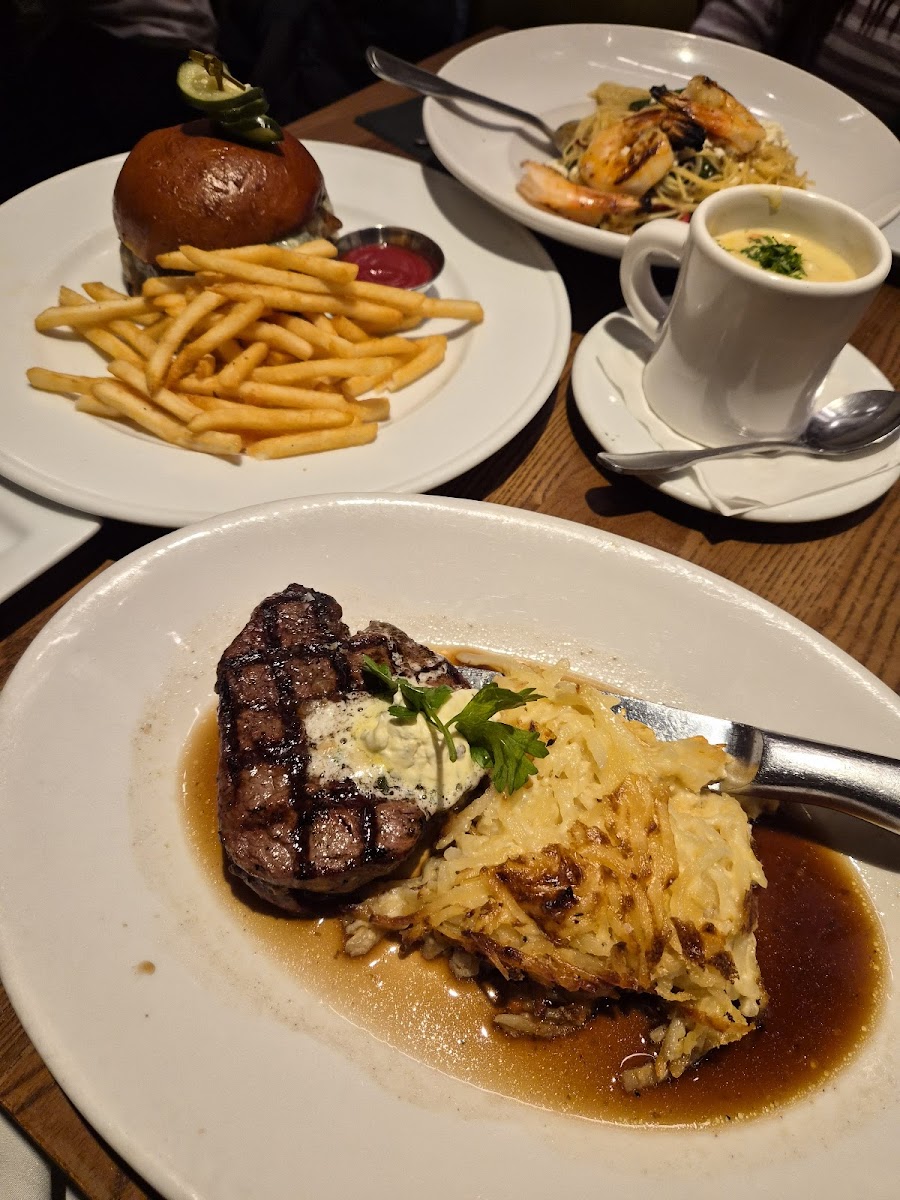 I had an amazing experience at Hazelwood! The petite filet was cooked to perfection—nice and red on the inside, almost as if it were still moving. A good vet could probably resuscitate it! The fries were perfect, with a crunchy exterior and a soft, delicious interior. As for the hash browns, oh my goodness! They were cheesy and creamy, reminiscent of a great bowl of mac and cheese. The restaurant offers ample parking, both above ground and in the underground garage. The ambiance was very chill and relaxing. The place has good vibes and energy, although it can get a bit loud. The menu features many great options, and I haven't had anything I didn't like. There is an excellent drink selection, and the drinks are generous in size. Our server, Kaiti, was fantastic in helping us with the menu and provided exceptional service. She made sure our drinks were always full and added laughter and humor, making our day memorable.